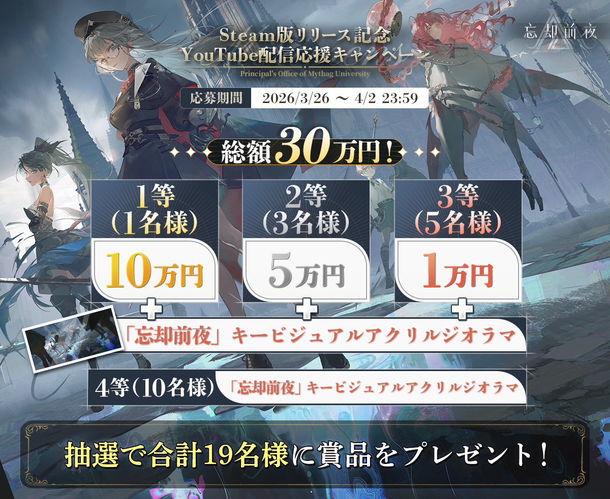 「忘却前夜」を遊んで感動したシーンや、戦術が上手く決まったシーンなど、様々なプレイ動画や実況動画をお待ちしております!